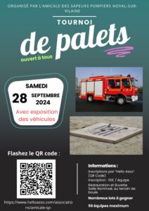 Tournoi de palets Noyal-sur-Vilaine Bonjour à tous, Les Sapeurs-Pompiers de Noyal-sur-Vilaine organisent un tournoi de palets le 28 Septembre 2024 à partir de 9h30 Lire la suite » 26-08-2024 Aucun commentaire